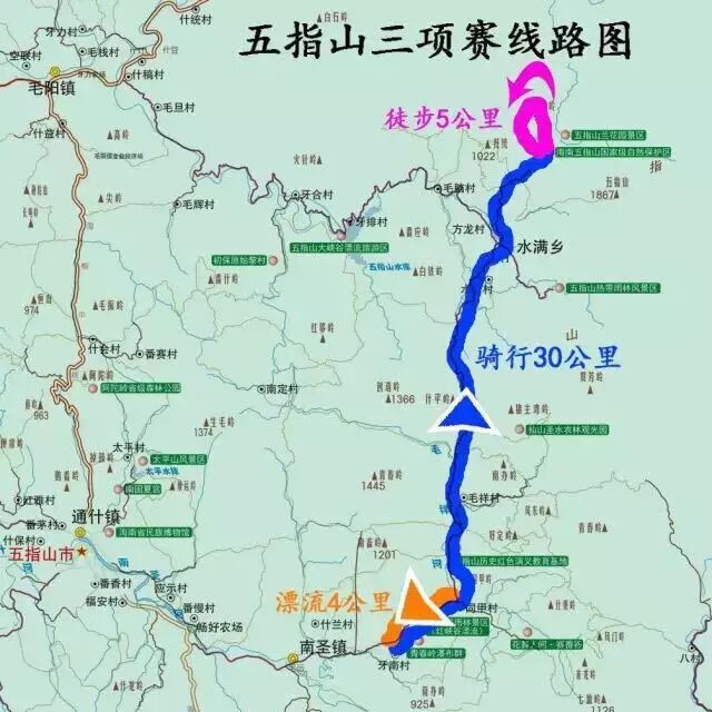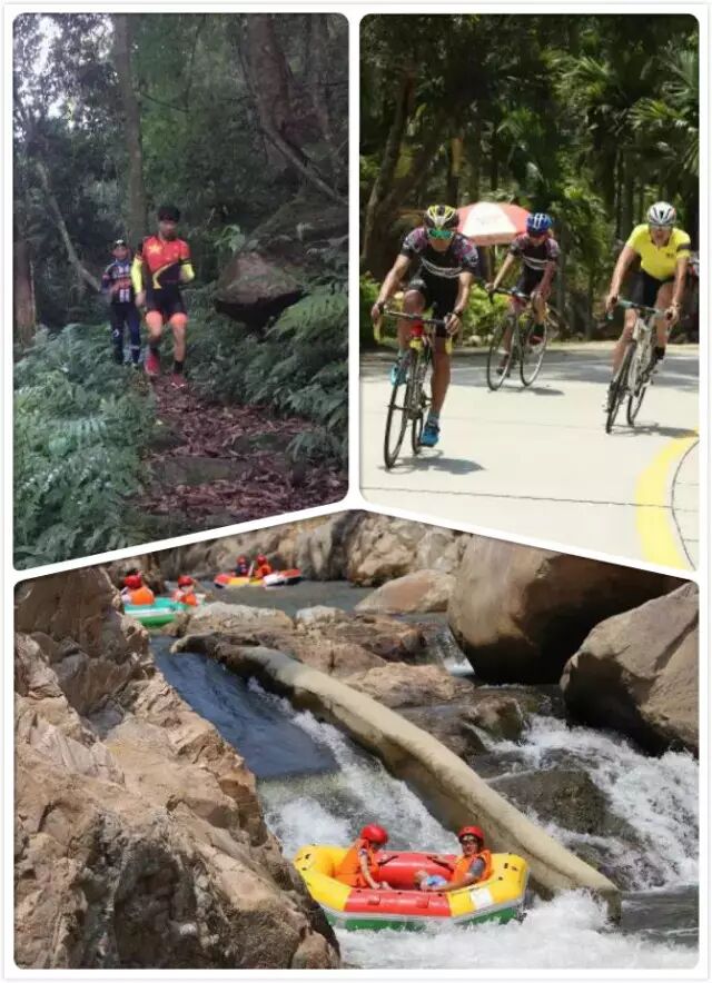 五指山三项是从体育项目中延伸出来的更具有互动性的户外运动,集漂流、骑行、越野跑三项户外运动项目,比传统的铁人三项更具新意。