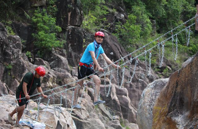 扣好安全扣脚成外八字踩在铁链上,通过。
